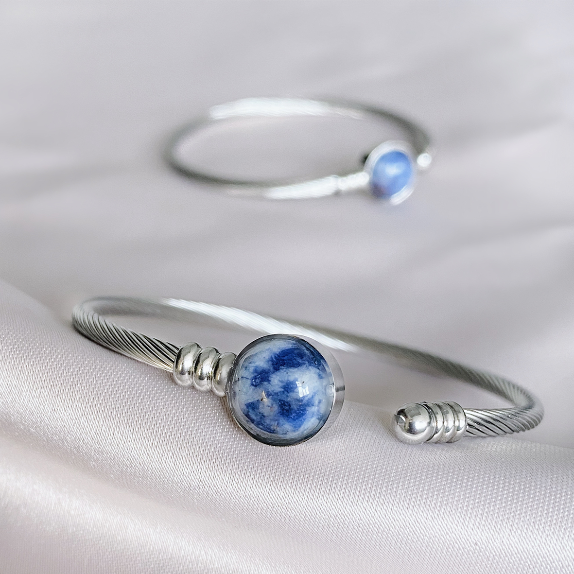 Like a veil of slow moving clouds shadowing the moon, the Blue Jade is a dreamy stone; a stone of calm amidst a storm.